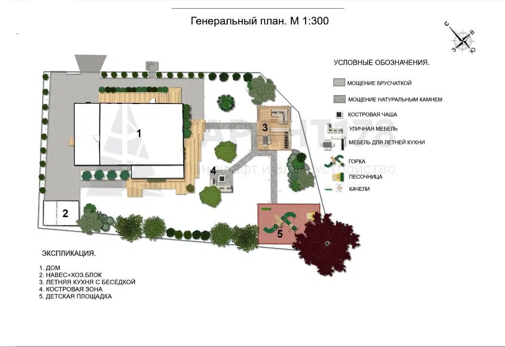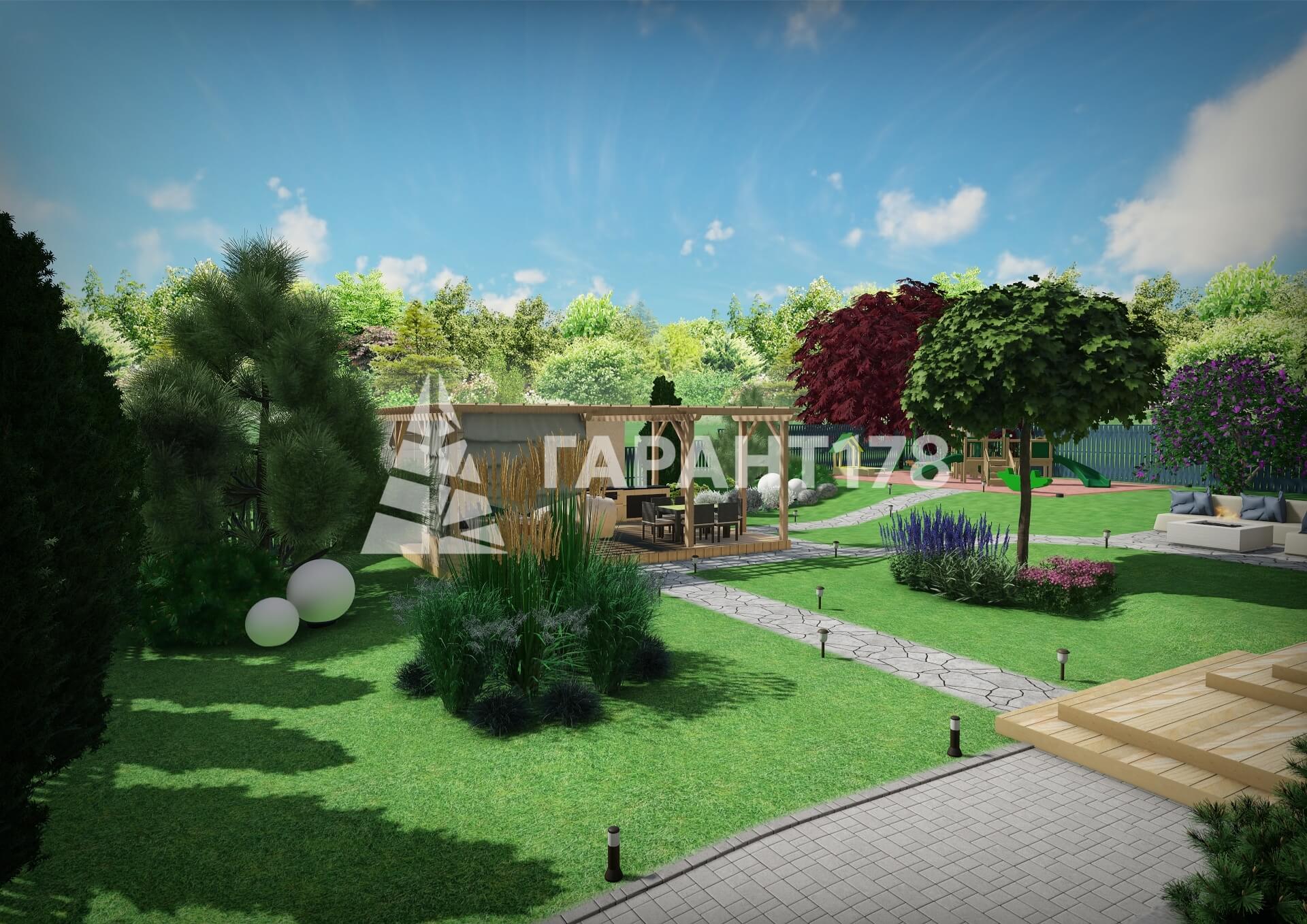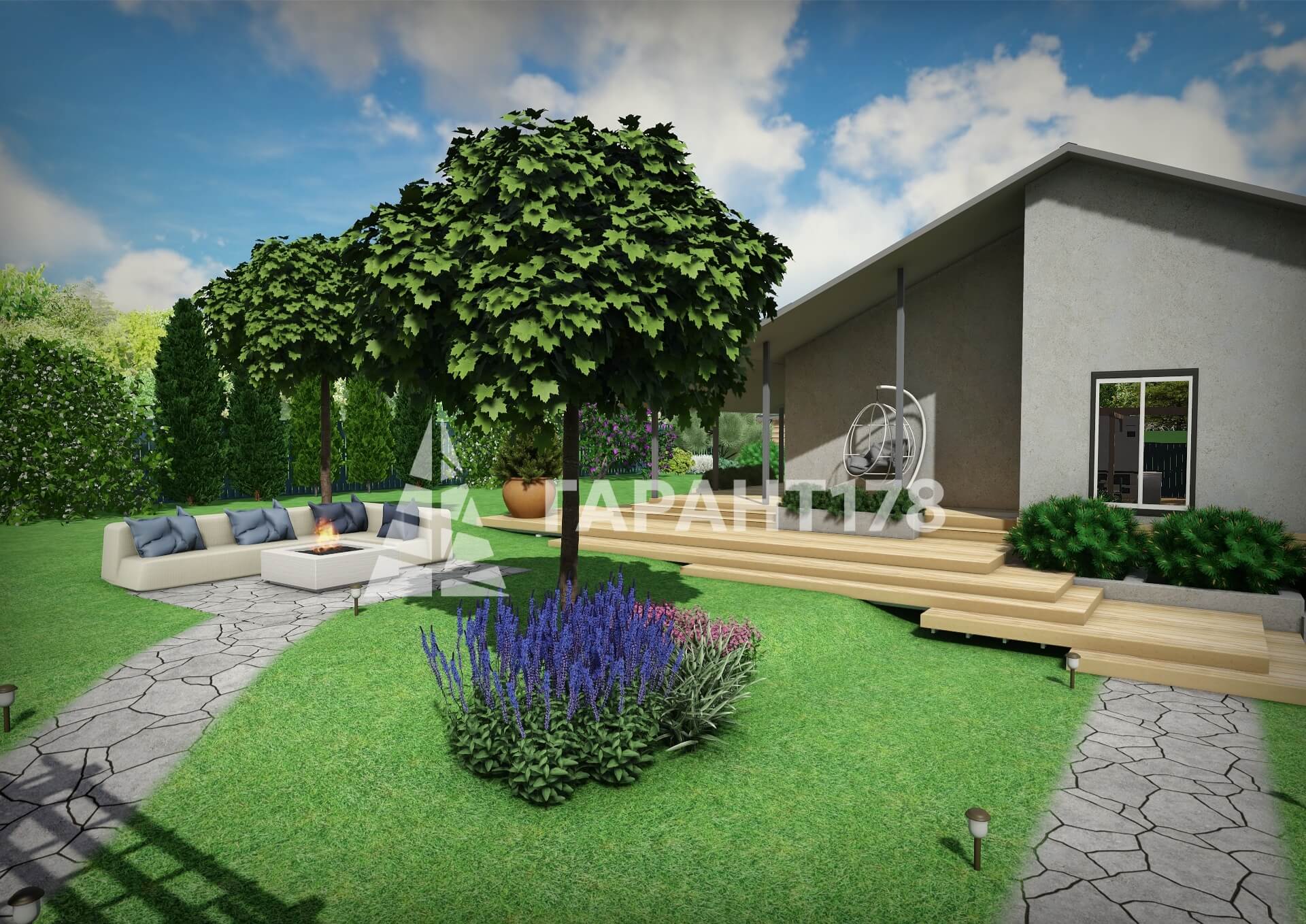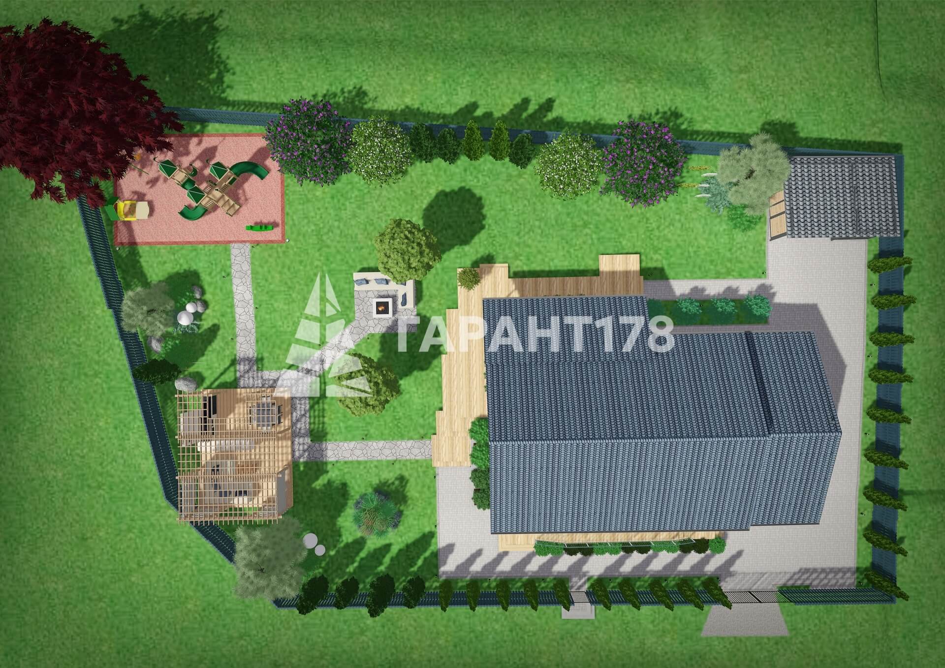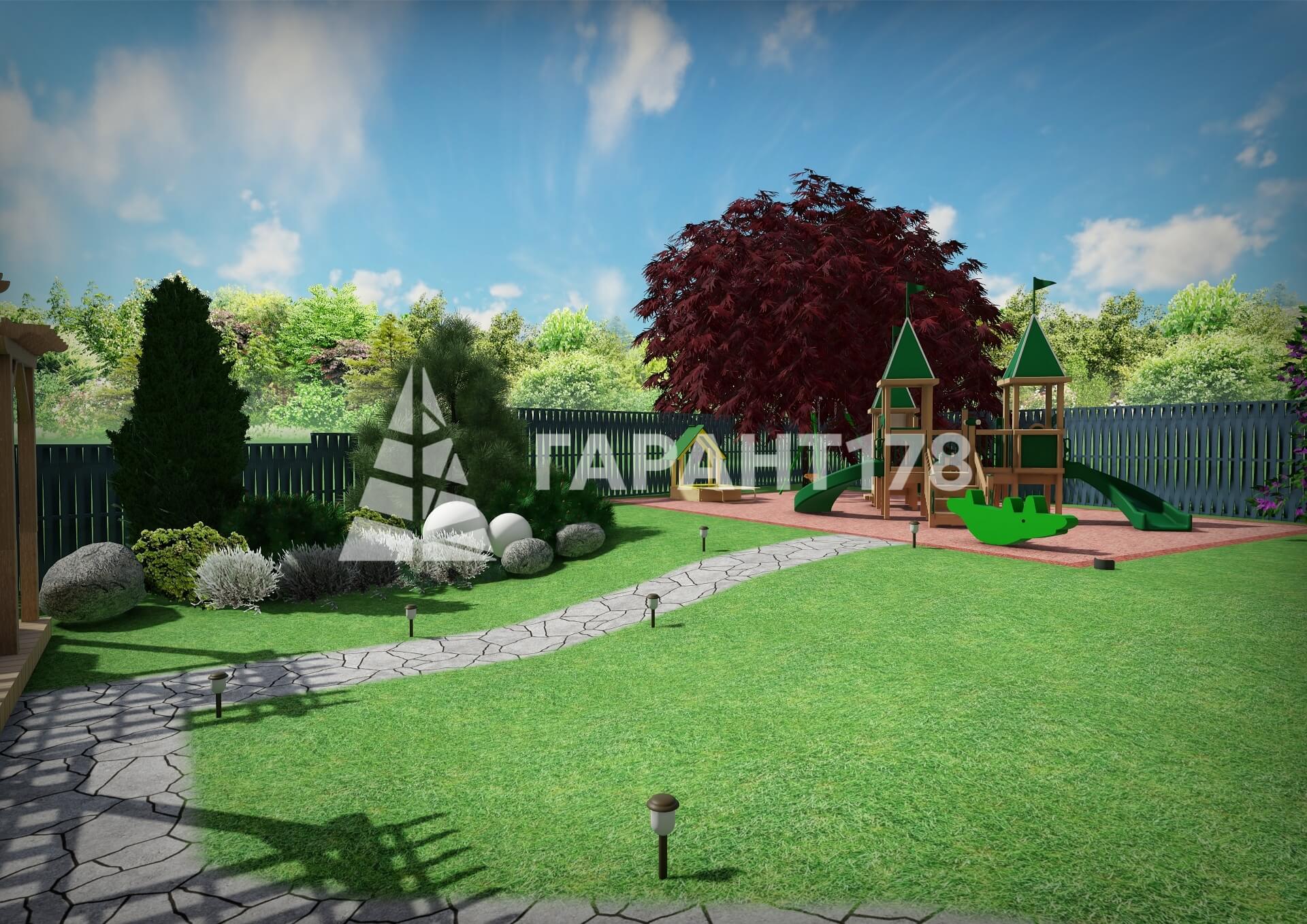 Нужно было спланировать летнюю кухню, детскую площадку, костровую зону, дорожно-тропиночную сеть и посадки. Рельеф не ровный, но было решено обойтись без подпорок, поэтому дорожки повторяют эти небольшие перепады, поднимаясь немного вверх к задней части участка. Посадки должны были быть малоуходовыми и больше хвои для круглогодичного озеленения.