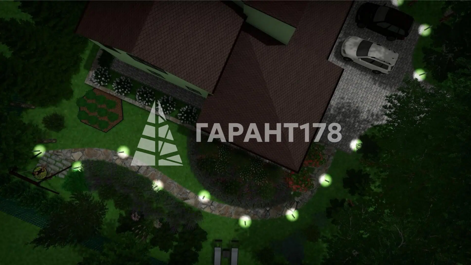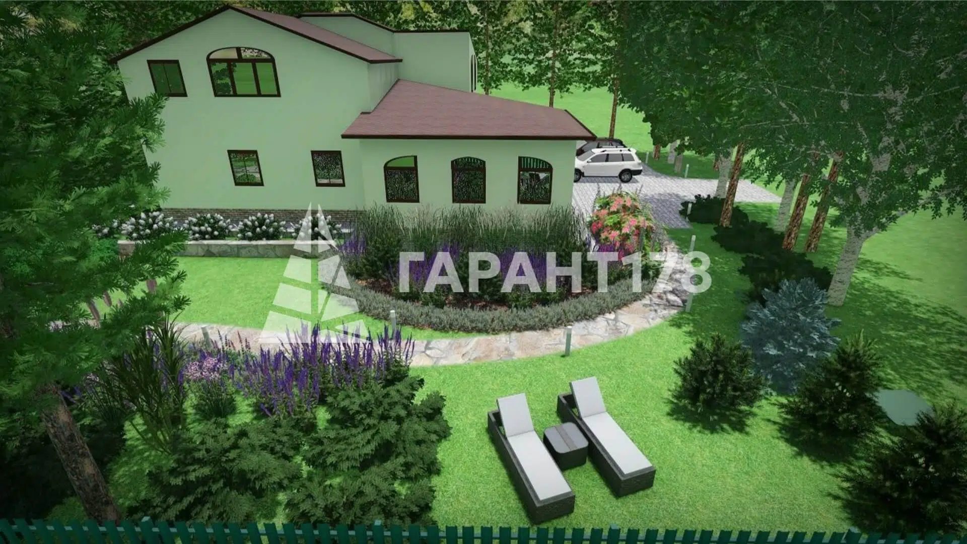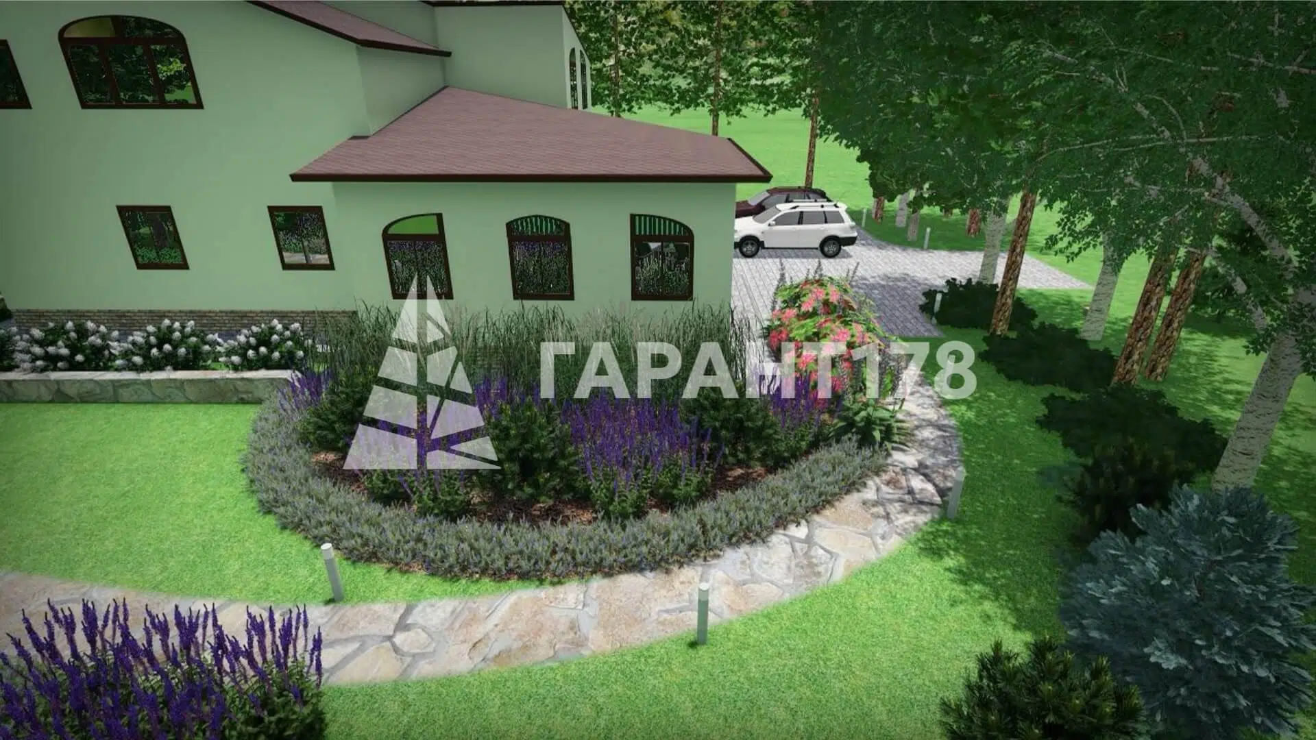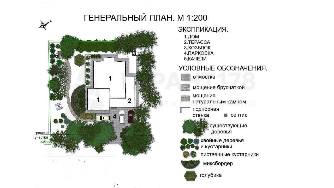 Нужно было гармонично вписать дорожно-тропиночную сеть, продумать расположение уличного освещения. Также расположить зону отдыха, парковку на несколько машин и зону для кустарников.