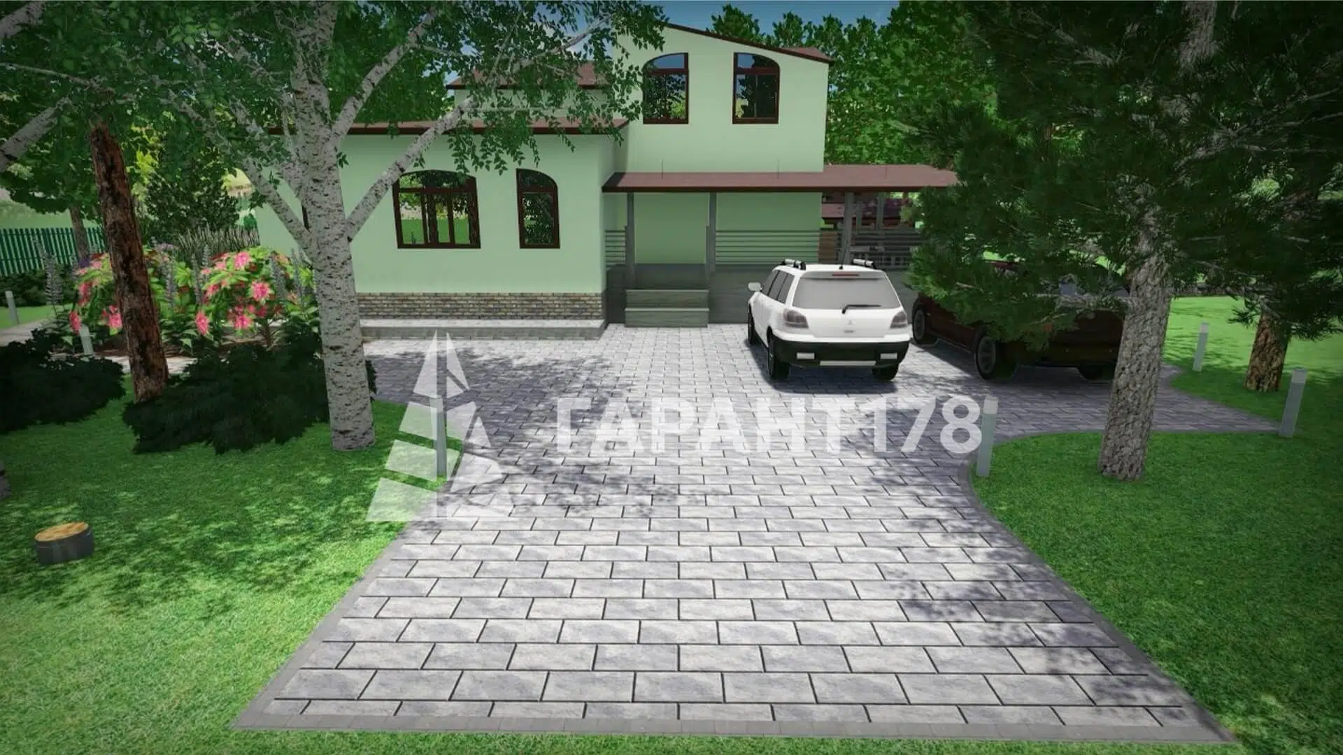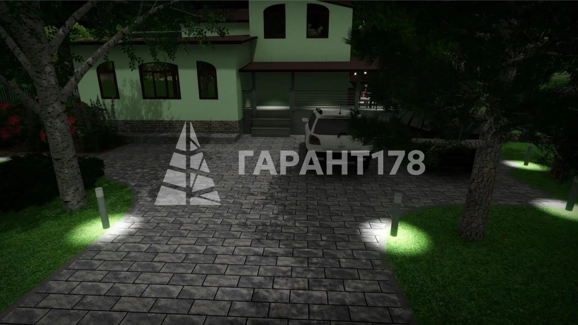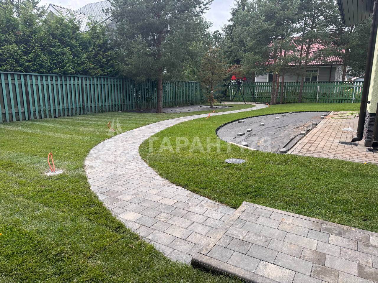 Нужно было гармонично вписать дорожно-тропиночную сеть, продумать расположение уличного освещения. Также расположить зону отдыха, парковку на несколько машин и зону для кустарников.