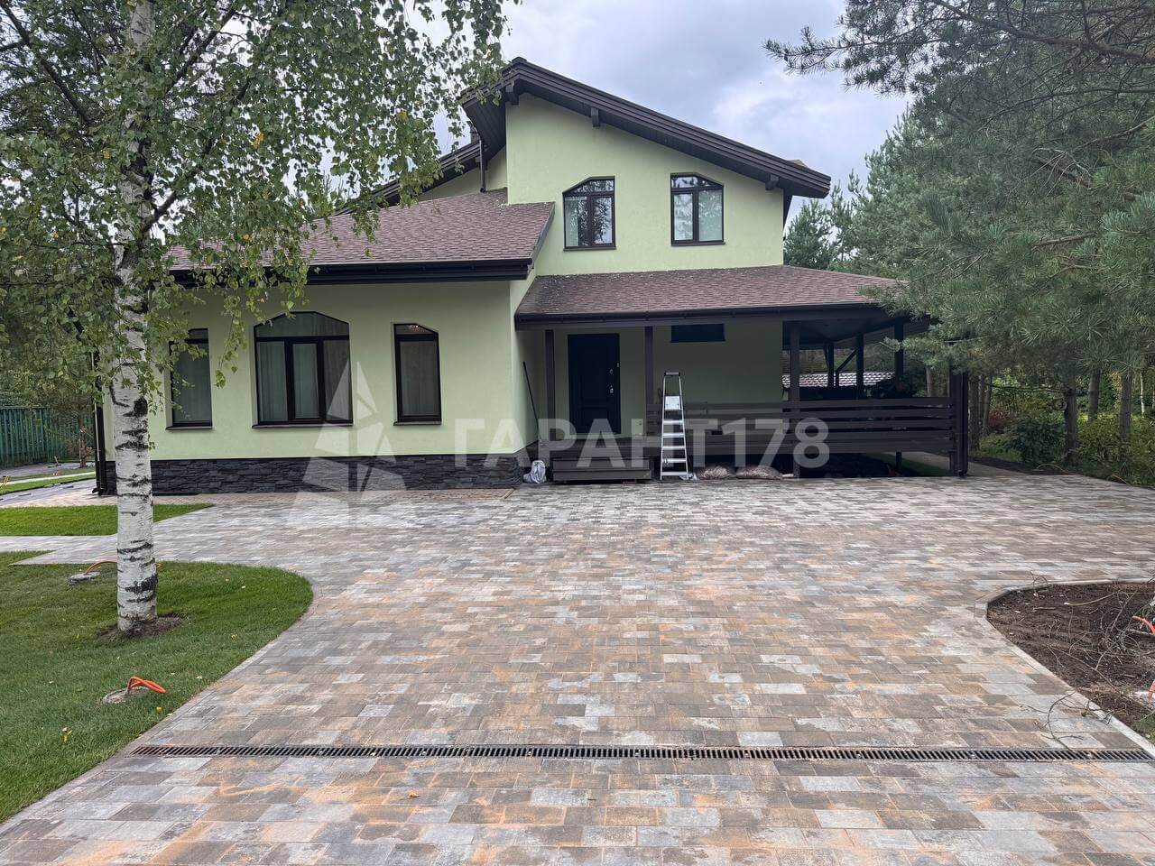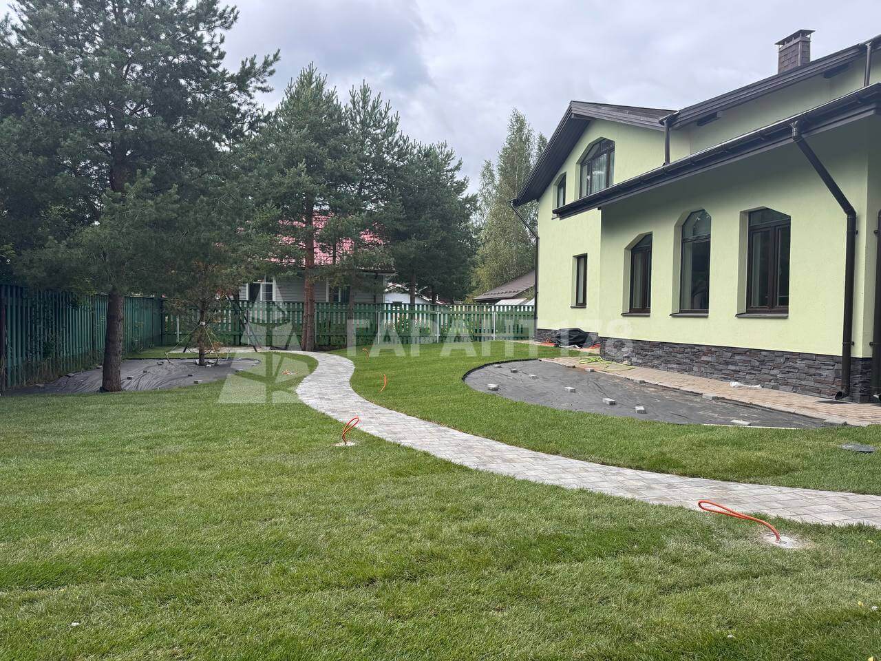 На участке уже имеется дом с готовой отмосткой и соснами вокруг.