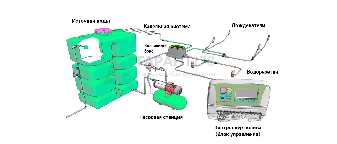 Система состоит из нескольких ключевых компонентов (на примере комбинированного автополива):